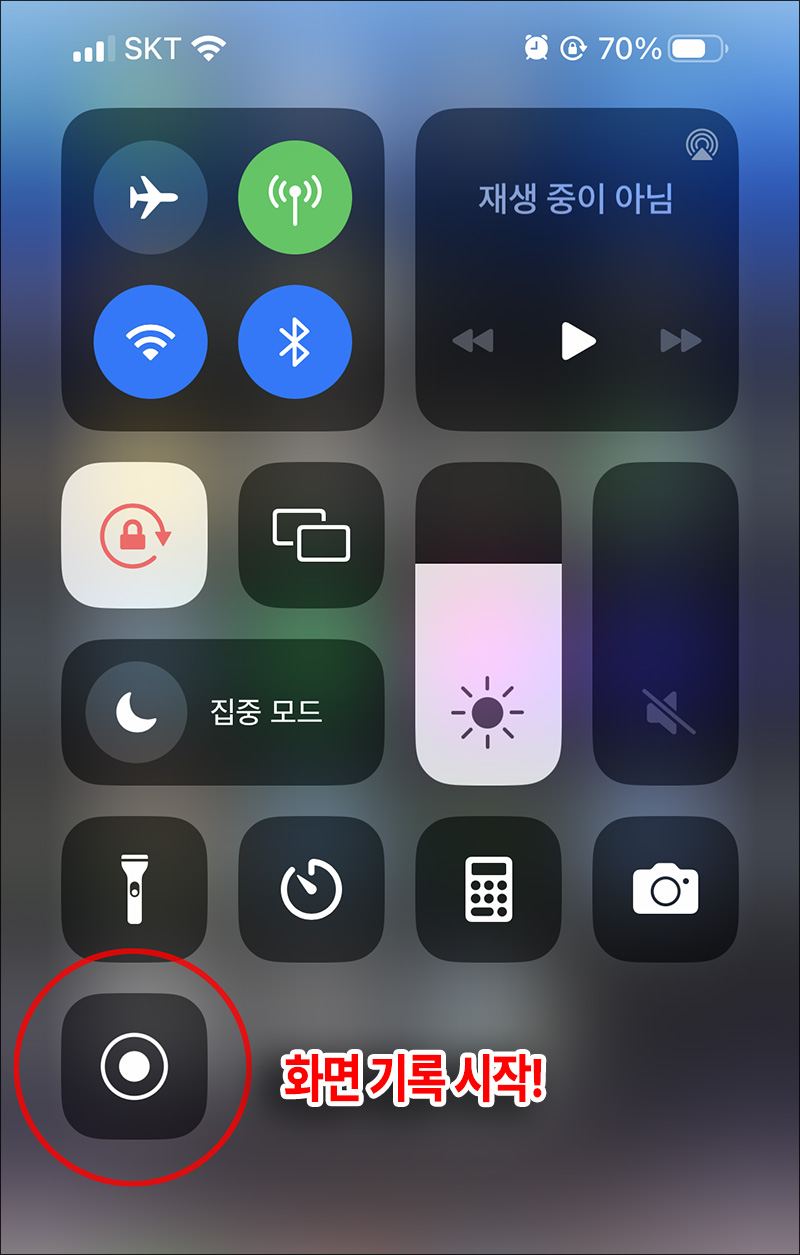 그러면 제어센터에 화면 기록 단축 아이콘이 추가되는데요. 아이폰X 이후 계열의 폰에서 우측 상단 부분을 끌어 내리듯 하면 보이는 아래와 화면이 제어센터 입니다.