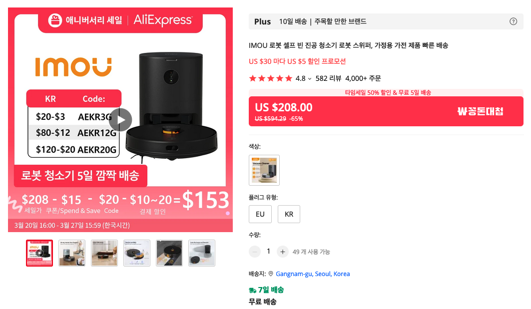 IMOU 이모두 로봇 청소기 입니다. 성능이 좋기로 명셩이 꽤 자자 합니다. KR를 선택하시면 한국향 제품으로 받을 수 있어서 더 좋죠. 이번 할인 기간때 꼭 구입해야 하는 아이템!