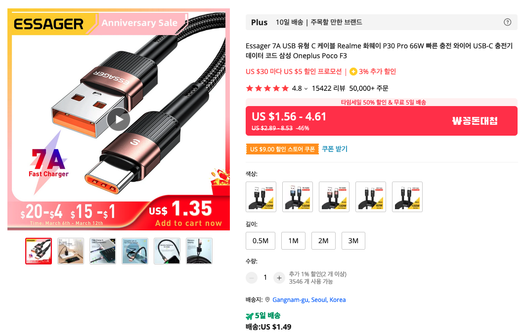 가성비가 좋은 Essager 케이블입니다. 품질은 최상급인데 가격은 최저가 수준이네요. USB C to A, USB C to C 중 필요한 것과 길이를 골라 구입하시면 됩니다.