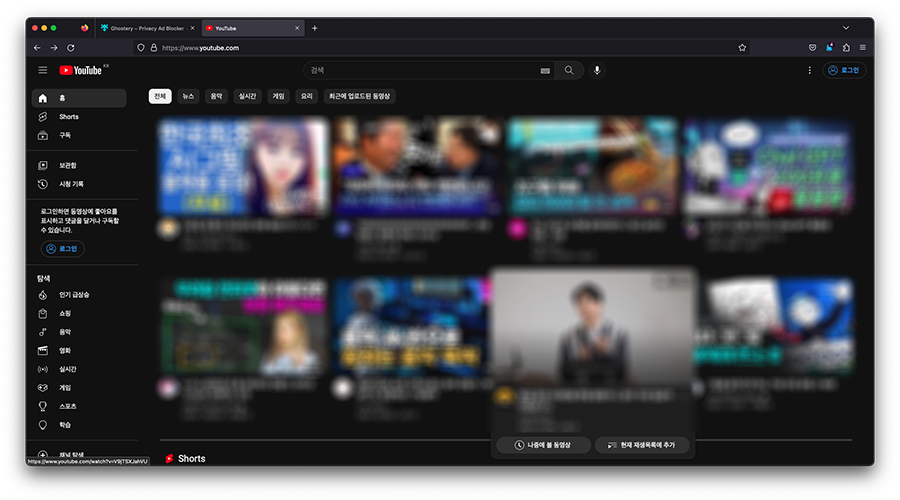 이제 유튜브로 이동해서 한번 리프레시를 하고 나서 사용하시면 광고가 나오지 않는 것을 확인할 수 있습니다. 광고 차단 프로그램 사용을 적극 권장하는 것은 아니지만, 한번쯤 필요할 때 간편하게 사용할 수 있으니 참고가 되시길 바랍니다 :)