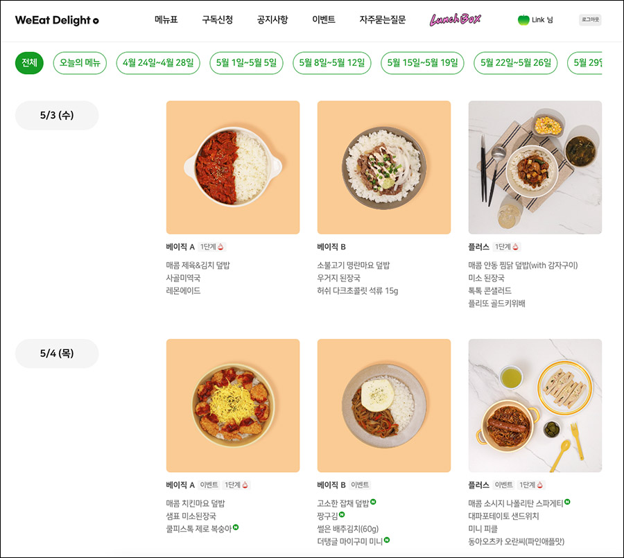그래서 대한민국 직장인 점심값아끼기 프로젝트를 해볼까 하다가, 점심식사를 구독할 수 있는 위잇딜라이트(WeEatDelight)라는 점심 메뉴 도시락 배송 서비스를 찾아내게 되었습니다. 마치 마켓컬리처럼 아침에 미리 점심식사 음식요리를 회사 앞에 배달해주는 것 같은데, 괜찮은 것 같아 이번에 구독을 하게 되었습니다.