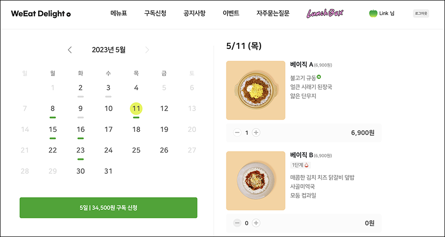 그리고 구독 날짜가 매우 자유롭게 선택이 가능해서, 저는 메뉴 보고 신청과 메뉴 안보고 신청을 조합해서 구독을 했습니다. 위잇 딜라이트 점심 도시락 구독 서비스는 결과적으로 원하는 날에만 식사를 배달 받을 수 있어서 꽤 잘 되어 있습니다.