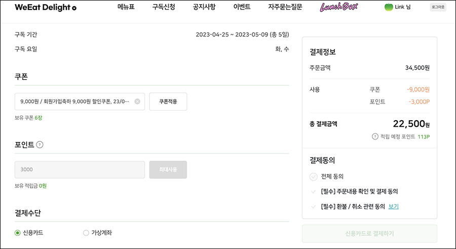 회원가입을 할 때 잊지말고 추천인코드를 입력하면 3000원 포인트도 얻을 수 있습니다. 저도 지인 추천으로 꽤 저렴한 가격에 점심식사 5~10일치를 미리 구독을 해두었어요.