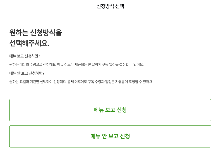 회원 가입을 마치고 이제 점심 식사 메뉴를 구독하면 되는데, 메뉴 보고 신청과 메뉴 안 보고 신청이 있습니다. 메뉴 안 보고 신청은 메뉴는 랜덤으로 오지만, 주기적으로 (예를 들어 월요일과 화요일에만 도시락을 먹는다 하면 이걸 선택하면 편함) 받는게 편하다면 신청하면 되고, 메뉴 보고 신청을 다음달에 있을 식단표를 보고 고를 수 있어서 좋더군요.