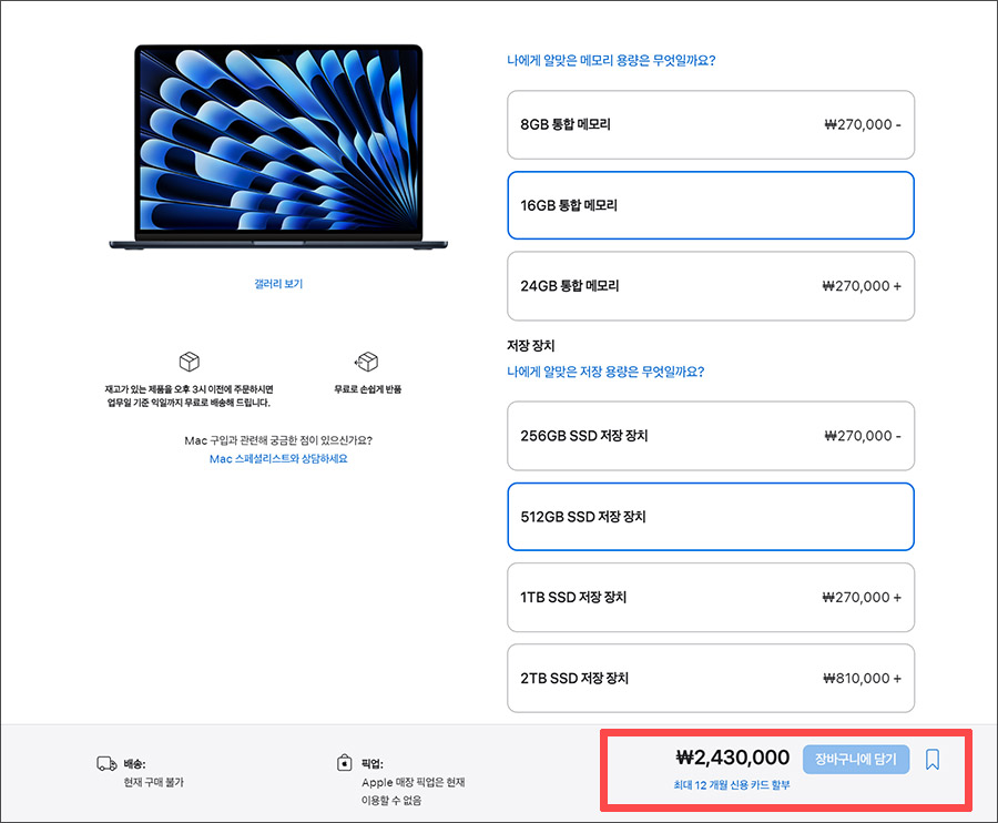아무튼 이번 맥북에어15인치 모델에서도 기본 스토리지 모델보다는 업그레이드된 512GB를 구입하시는 것을 권장해봅니다. 램도 16GB로 올리는 것이 좋구요. 그렇게 했을 때 권장사양의 출고가는...