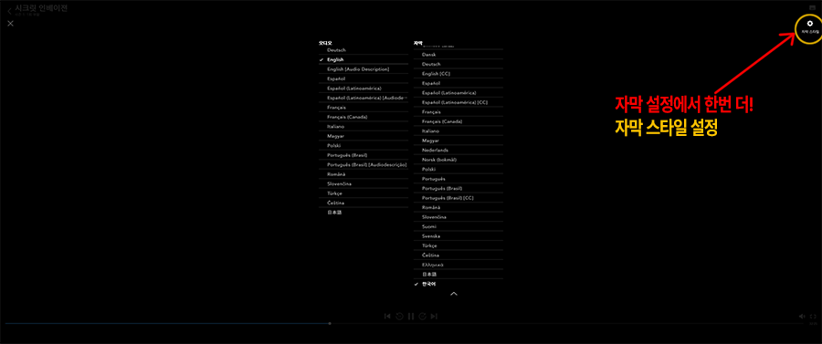 이렇게 자막 오디오 언어와 자막 언어를 설정할 수 있는데요. 해당 화면에서 한번 더 오른쪽 위를 보시면 이번에는 자막 스타일 설정 메뉴로 한번 더 들어갈 수 있는 것을 확인할 수 있습니다.