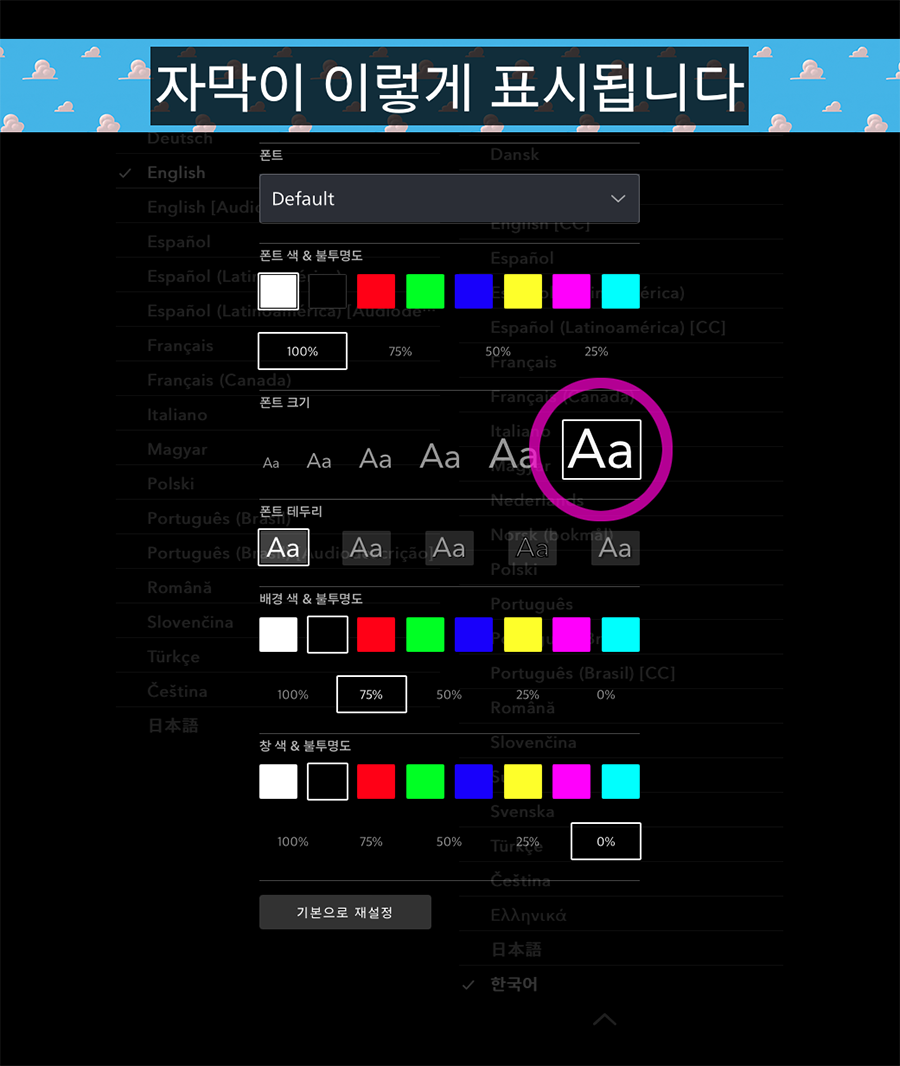 그래서 저처럼 자막 크기를 조절하고 싶으신 분들을 위해 팁을 남겨 봅니다.