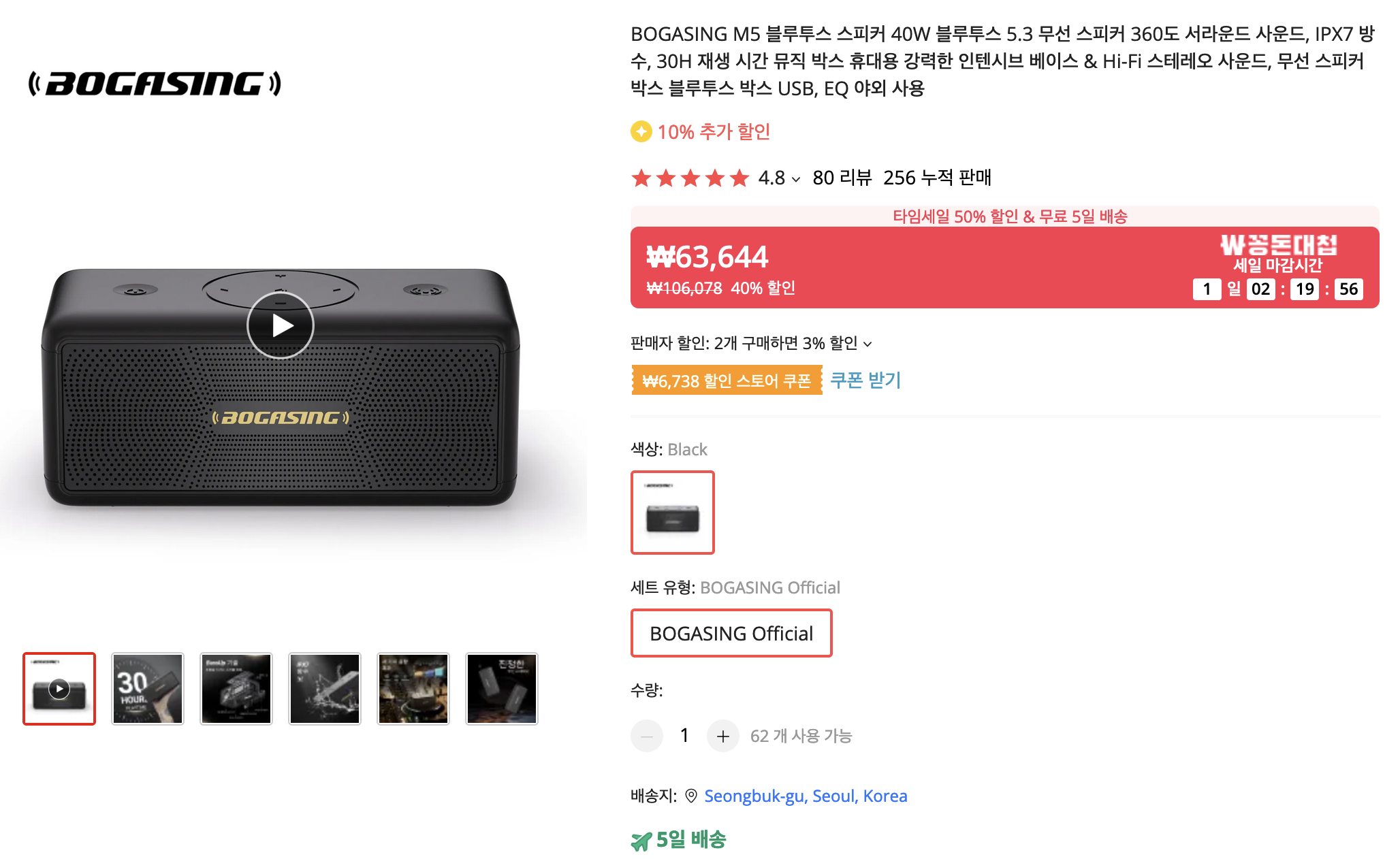 가성비가 좋고 음질이 괜찮은 보가싱 스피커 입니다. TWS로 2개의 스피커를 연결해서 사용하기에도 좋다고 하네요.