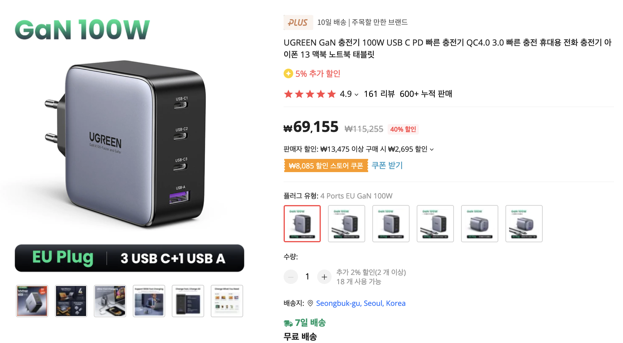 USB 충전기입니다. 노트북 부터 스마트폰까지 멀티 충전기가 필요하다면 안정적인 이 제품을 구입해서 사용해보시면 좋겠네요. USB-C 포트가 3개라서 여러모로 유용합니다.