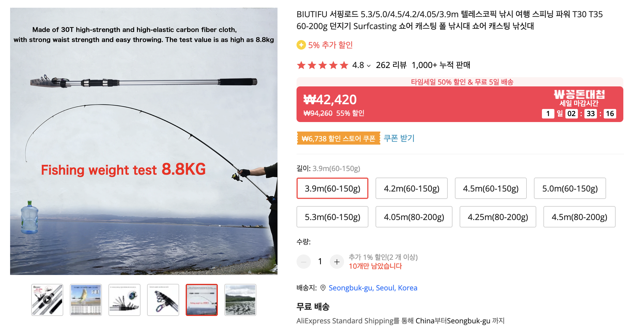 튼튼한 서프 낚시대 입니다. 역시 낚시용품을 찾는 분들께서는 이렇게 퀄리티가 검증된 제품을 구입하시는 것이 좋겠죠 ㅎㅎ