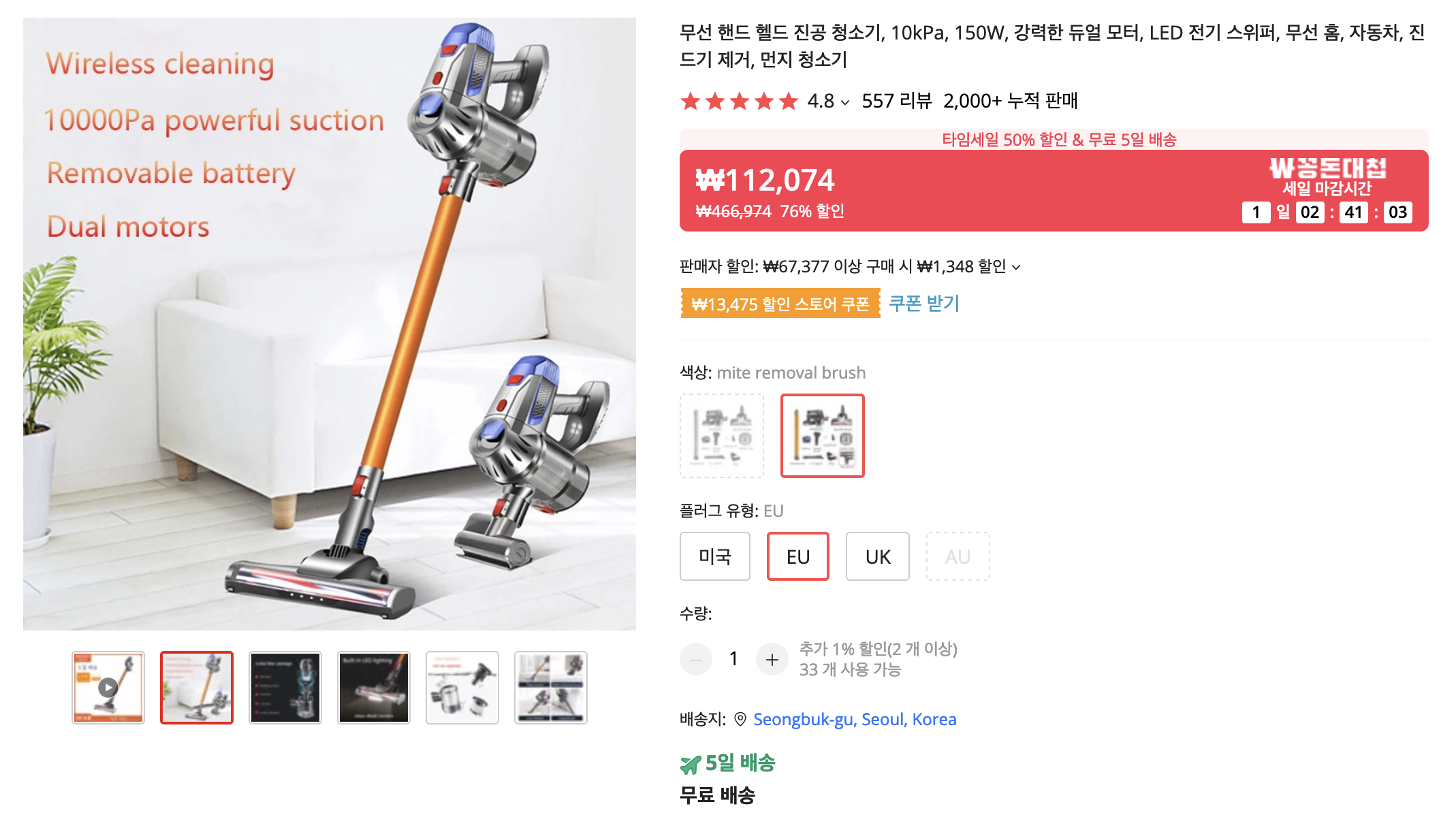 후기를 보면 알수 있듯, 요즘 가성비 좋기로 유명한 무선 진공청소기 입니다. 가격이 좋을 때 꼭 하나 들여다 놓으세요. EU 플러그 유형으로 구입하시면 됩니다.