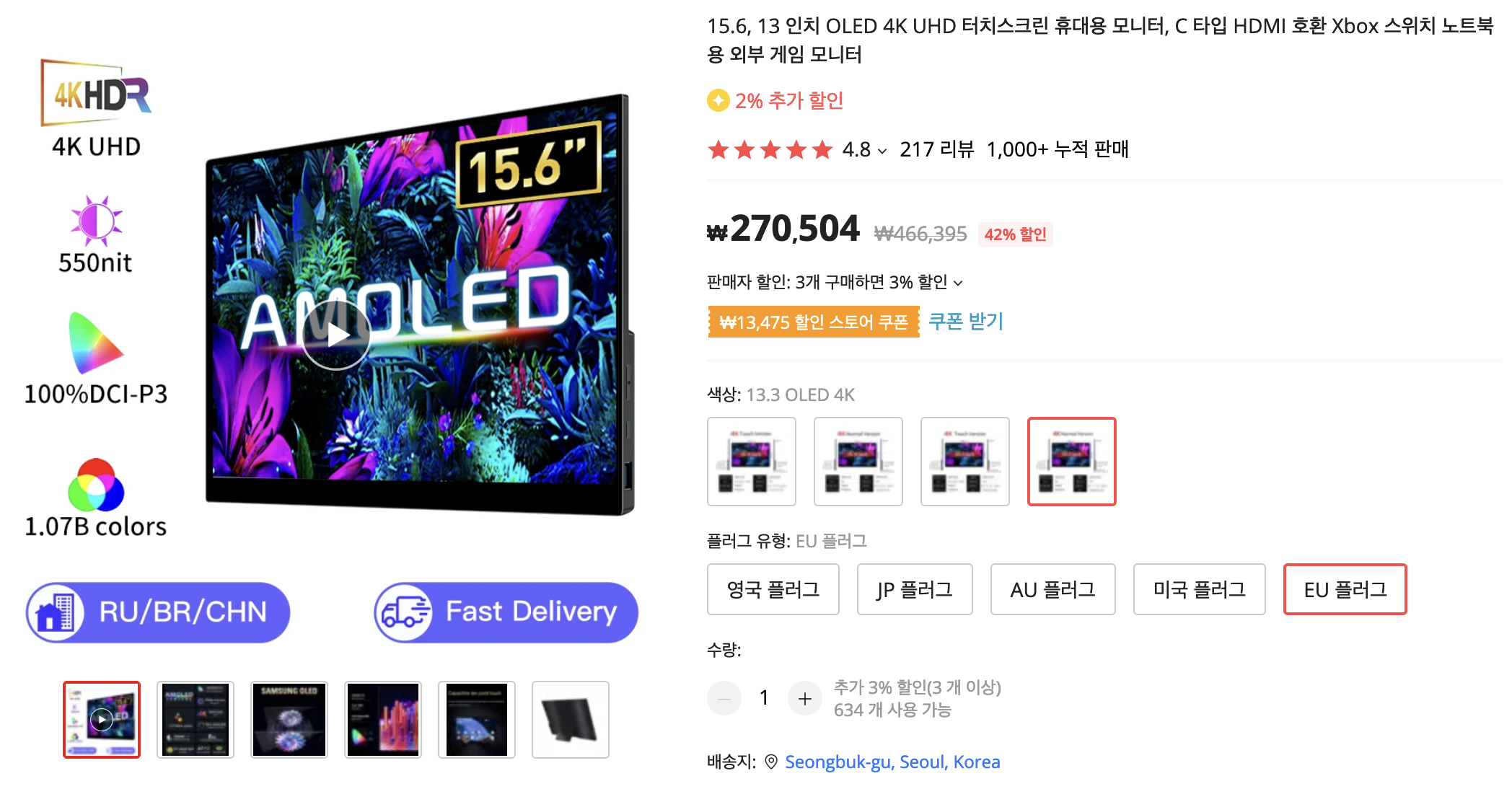 휴대용 모니터 입니다. 13인치, 15인치 모델과 터치용, 비터치용 모델로 구분이 되어 있네요. 고화질 보조 모니터가 필요한 분들께 추천해봅니다. :)