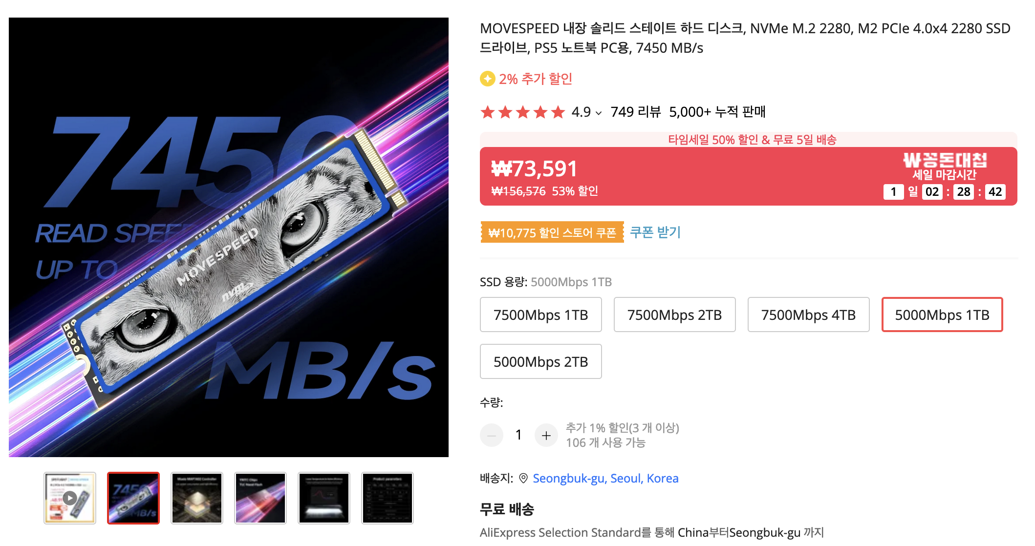 자 여기서 부터는 컴퓨터 용품입니다. M2 SSD이고 읽기 속도 속도와 용량이 준수하네요. 쓸만한 내장 SSD를 찾고계셨다면 좋은 가격에 구입해보세요.