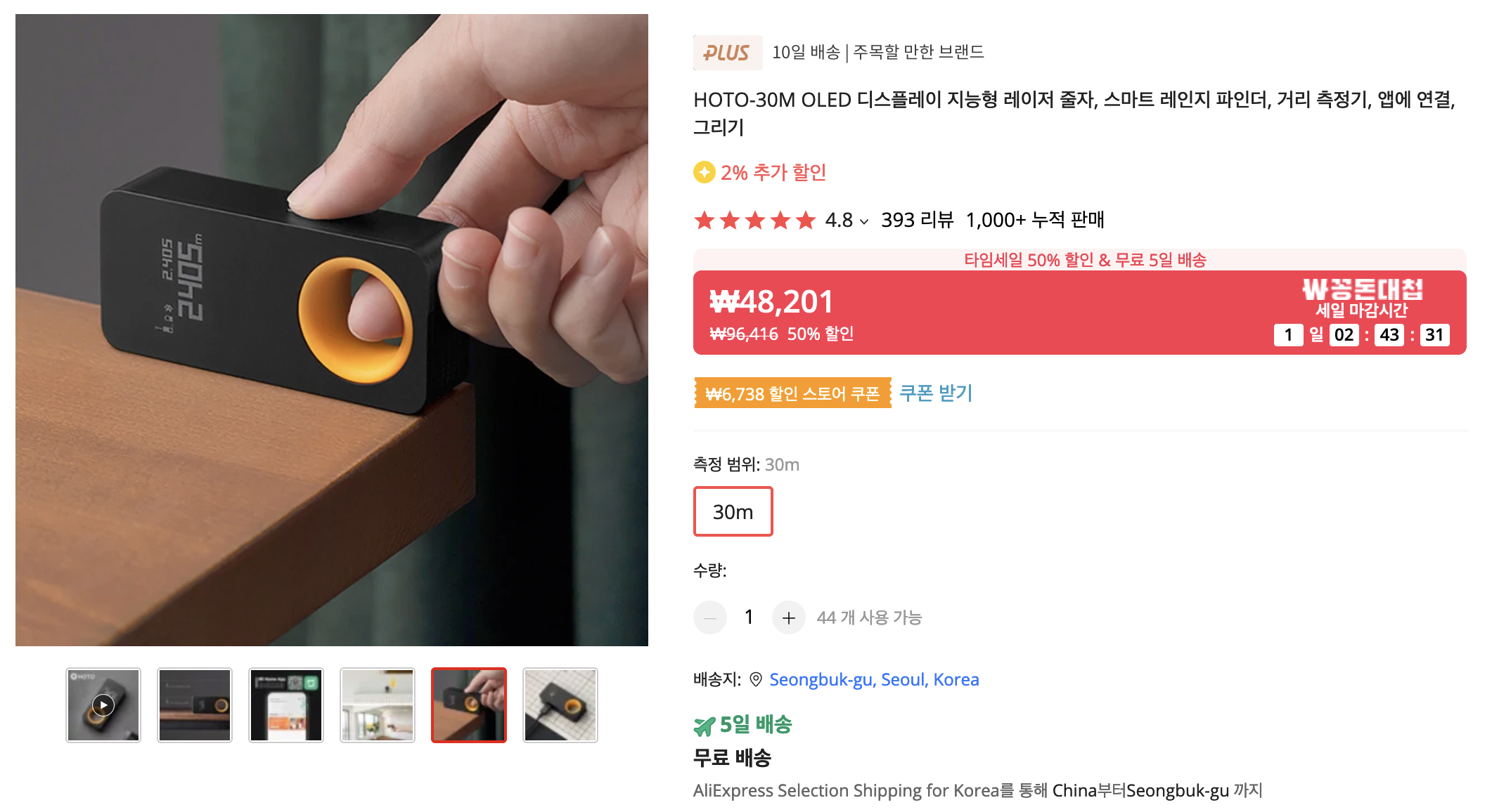 하나 있으면 줄자나 눈대중으로 길이를 잴 필요가 없어서 역시 셀인(셀프 인테리어)나 가구 위치를 변경하시는 분들께 하나쯤 꼭 필요한 필수템입니다. 저도 2개 구입해서 사용하고 있는데 정확도도 좋고 간편하게 사용할 수 있어서 좋아요.