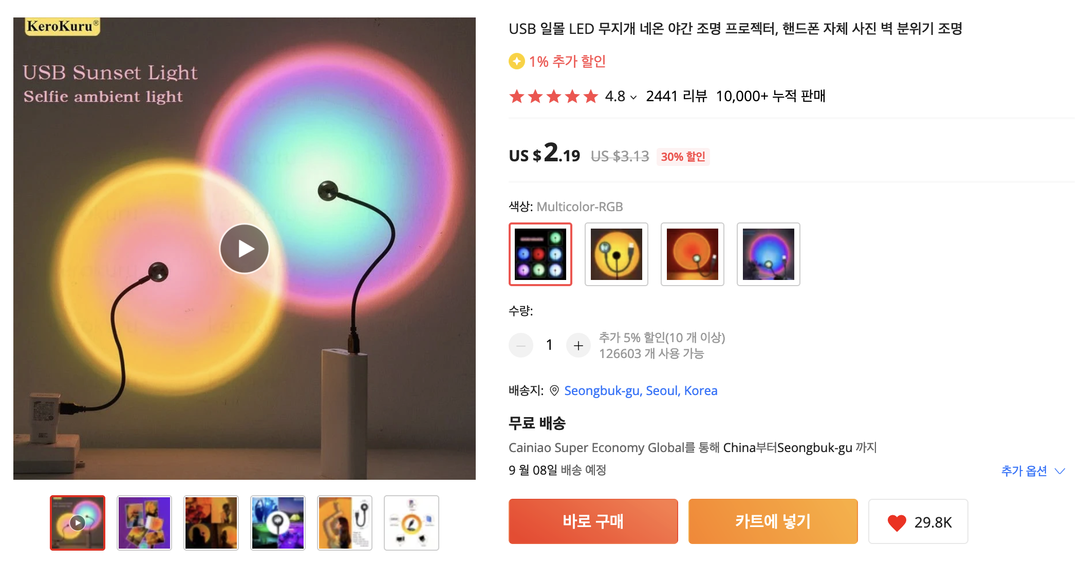 마지막으로 제가 개인적으로 좋아하는 일몰 효과 무드등 입니다. 여러가지 컬러로 전환이 가능하고, 방에 켜두면 분위기가 참 좋습니다. 보조배터리에 끼워서 사용해도 되서 간편하구요 :)
