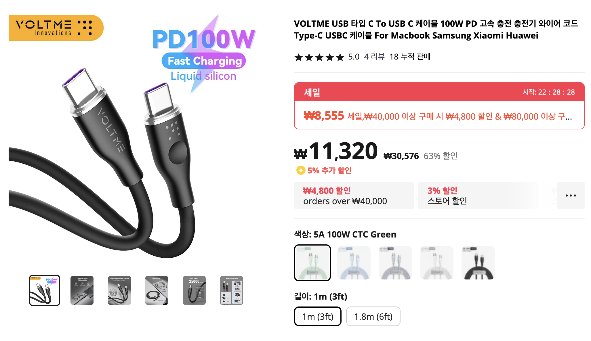 부드러운 실리콘 재질로 코팅이 되어 있는 케이블입니다. 100W짜리를 고르시면 됩니다. 그리고 되도록 1.8m 긴것으로 구입해두시면 두고두고 잘 샀다고 생각할 케이블입니다.