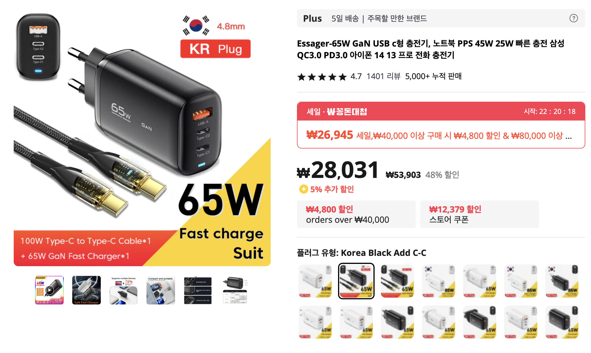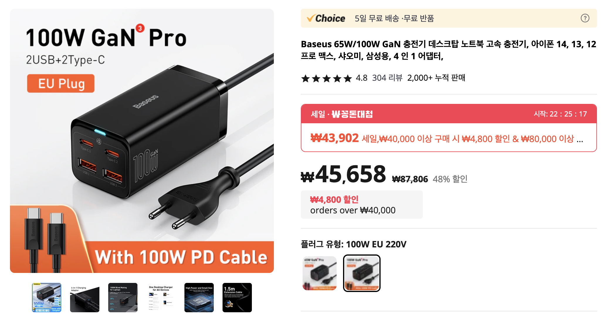 집에 꼭 하나쯤은 있어야 하는 USB PD 멀티 충전기 입니다. 100W는 노트북 같은 제품에 적합하고... 65W의 경우 1개의 USB-A 포트는 저속 충전기 가능하고 휴대하기 좋아서 추천하는 편입니다.