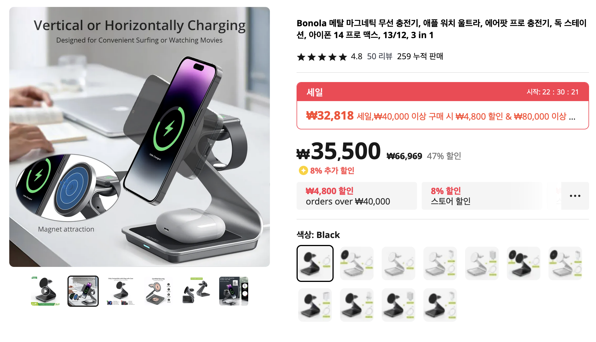 아이폰, 에어팟, 그리고 애플워치를 동시에 충전할 수 있는 무선 충전기, 충전대 입니다. 이 메이커는 아직 한국에는 잘 알려지지 않았지만, 제가 사용해본 십수개의 제품들 중 가장 퀄리티가 좋습니다. ㅎㅎ 정말 저만 알고 싶은 꿀템이죠.