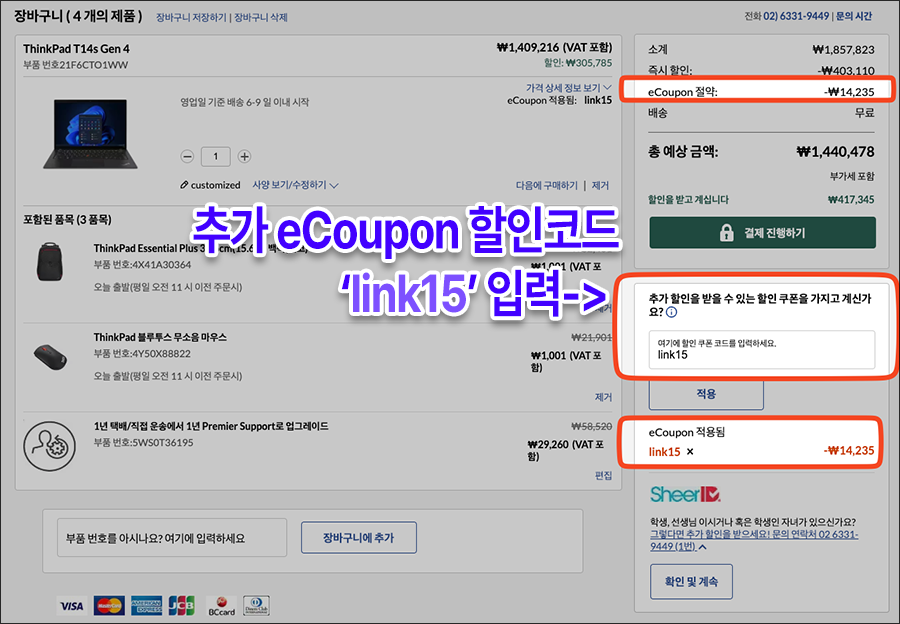 자 그러면 이제 원하는 사양으로 업그레이드 시킨 씽크패드 T14s 4세대 노트북을 구입하기 위해 장바구니에서 '할인 쿠폰' 입력 란데 link15를 입력하고 적용을 누르면!