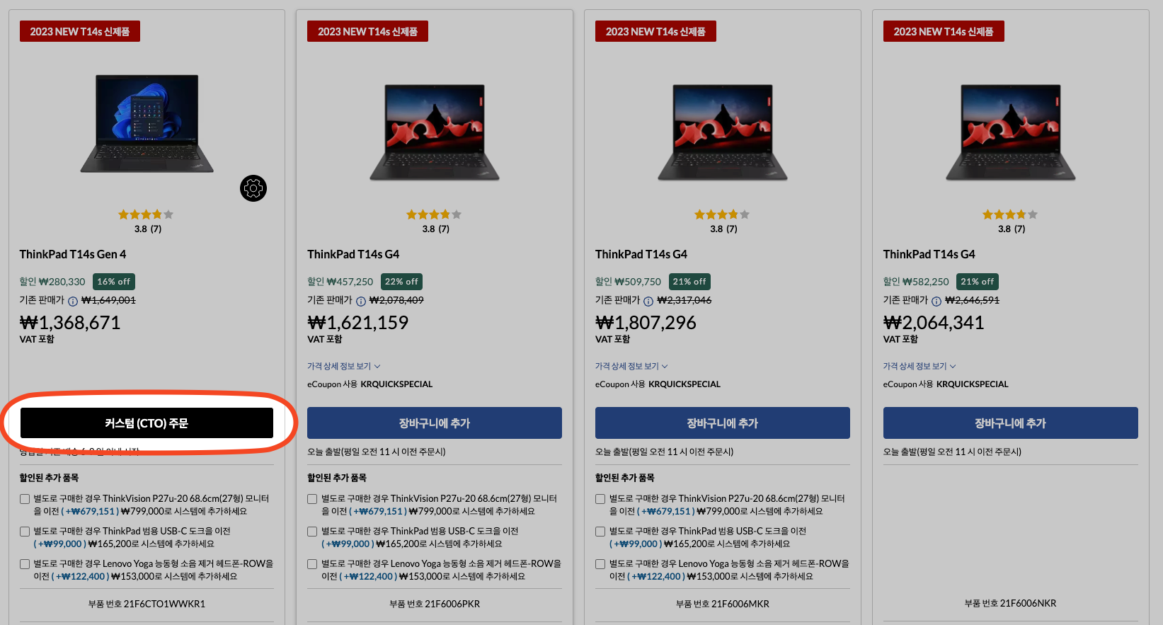 가장 먼저 살펴볼 모델은 ThinkPad T14s 4세대 모델입니다. 그리고 주문제작(CTO) 모델을 선택해서 원하는 사양으로 업그레이드해서 주문하시는 것을 권장 드립니다. 씽크패드는 이렇게 내 입맛에 맞게 주문제작하는 것이 매력이 있기 때문이죠.