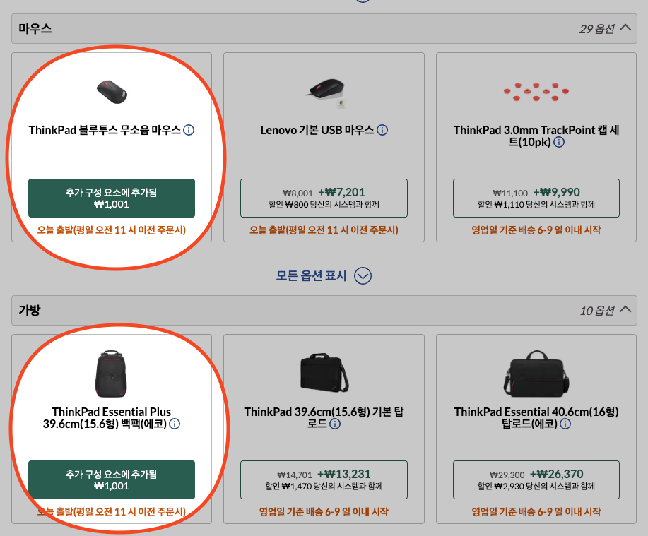 그리고 요렇게 이벤트 기간에 1001원만 추가하면 얻을 수 있는 마우스나 백팩은 사은품에 가깝습니다. 기본으로 선택이 되어 있는데, 구입하기 전에 꼭 같이 들어있는지 확인하시구요. 보통 CTO로 주문을 하게 되면 마우스랑 백팩이 먼저 오고, 본체 배송은 주문제작이 들어간 뒤에 배송이 시작됩니다. ㅎㅎ