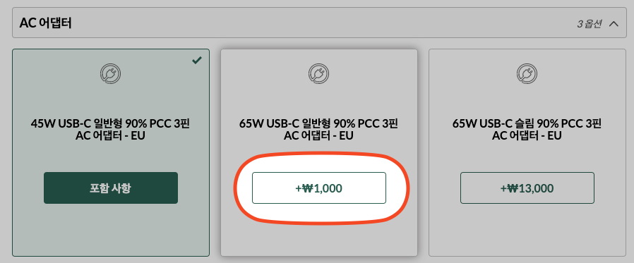 충전 어댑터도 65W로 변경이 가능한데, 천원만 더 추가하면 됩니다. 레노버 씽크패드 USB PD 충전기는 성능이 좋기로 유명해서 타사 노트북 유저들이 따로 구해서 구입할 정도로 인기가 좋으니, 65W 고속 충전기를 선택하시기 바랍니다. 이렇게 해야 효율이 좋습니다.