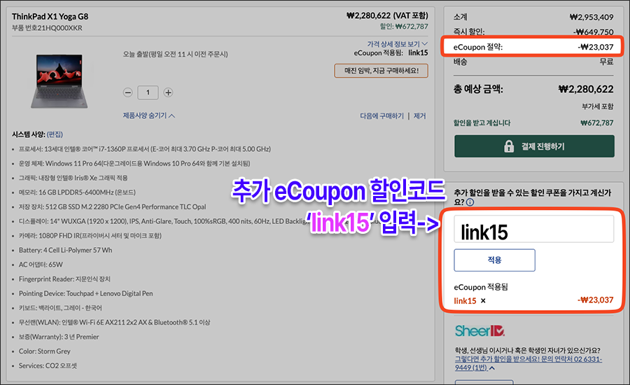 레노버 씽크패드 추가 할인 쿠폰코드: link15