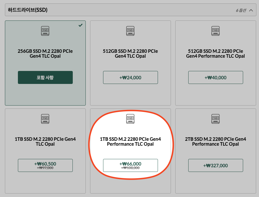 먼저 스토리지 입니다. 지금은 위와 같이 파격적인 할인을 통해 6만 6천원만 추가하면 고성능 1TB 용량으로 스토리지 옵션을 선택할 수 있습니다. 요즘 이상하게 램 보다는 스토리지를 넉넉하게 가져가는 것이 여러모로 편하더군요.
