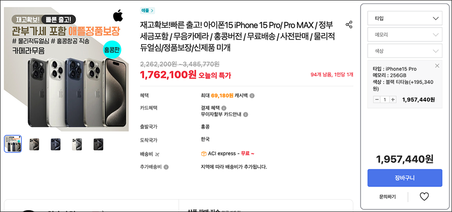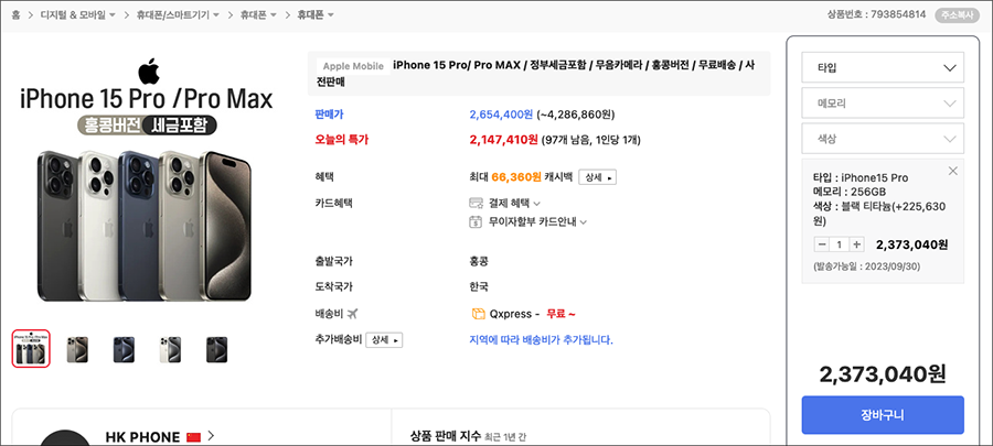 일단 아이폰15프로의 경우에는 256GB 모델 기준으로 237만원 정도에 가격이 형성되어 있습니다. 관부가세포함입니다. 3~4 셀러가 주로 홍콩판 아이폰을 판매하는데, 일부 셀러는 관부가세 포함이고, 일부는 아닙니다. 그러니 구입 전에 관부가세 포함인지 아닌지를 꼭 상품페이지에서 확인하세요.