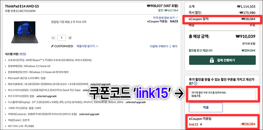 가장 비싼 모델인 i7-1355U, 32GB 램, 1TB SSD 탑재 모델 기준을 쿠폰코드 link15을 입력하면...