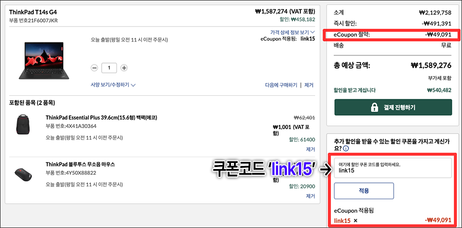 장바구니에서 결제를 하실 때 쿠폰코드 link15를 입력하시면 조금 더 할인을 받으실 수 있습니다.