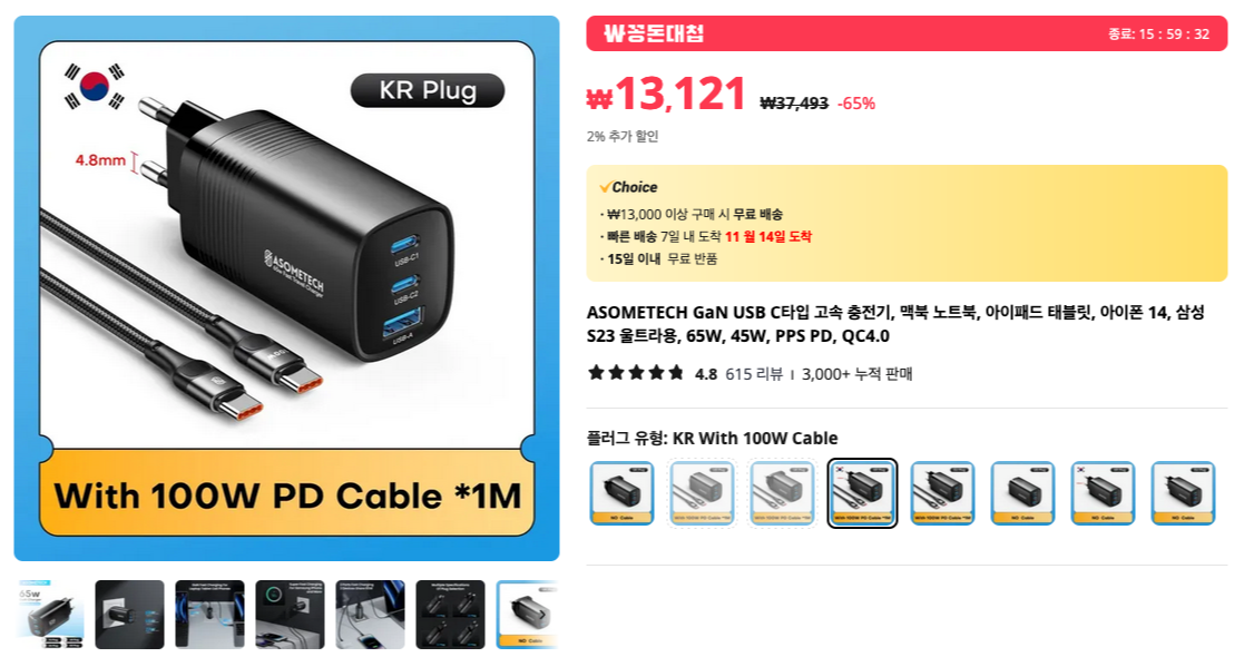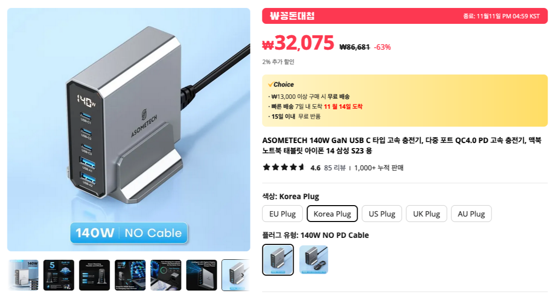 140W까지 출력이 되는 GaN 멀티 충전기 입니다. 한국형 플러그를 선택할 수 있어서 더 좋죠. USB-C 포트 3개와 USB-A 포트 2개로 최대 5개의 기기를 충전할 수 있습니다.