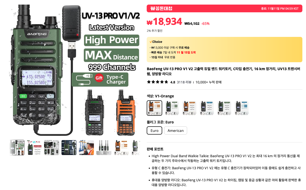고출력 워키토키 입니다. 요즘 다들 스마트폰을 쓰는 시대이지만, 이런게 필요할 때도 있는 거니까요. 검색을 해보니 꽤 인기가 좋은 제품이더군요. 필요하신 분들께 추천