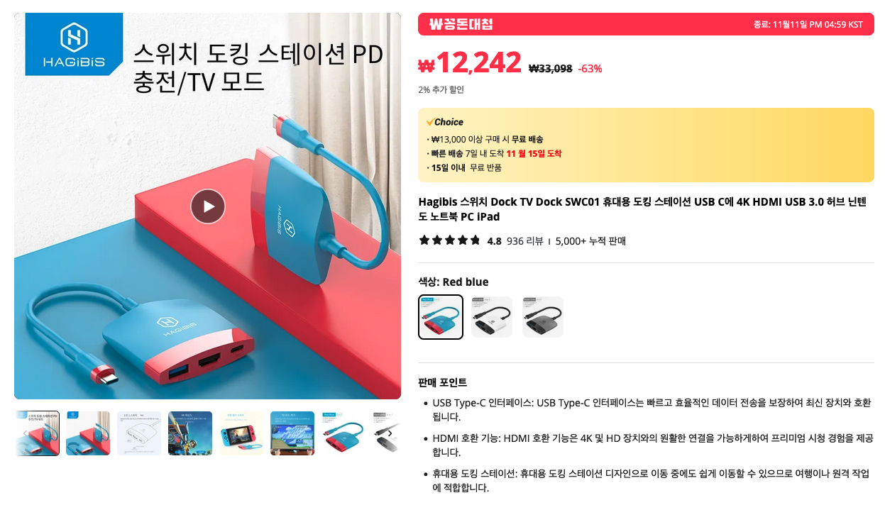 닌텐도 스위치를 위한 HDMI 연결 어댑터 입니다. 정품 충전독이 없으면 TV연결이 어려웠는데, 이게 있으면 모두 해결되기 때문에 인기있는 아이템이죠 :)