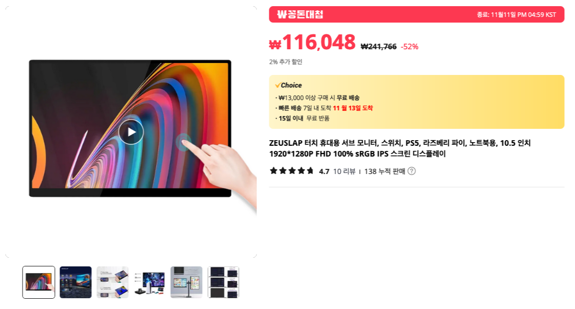 제우스랩의 휴대용 모니터 입니다. 요건 스크린은 10.5인치로 작지만 터치가 되는 모델이네요. 가격이 괜찮게 나온 것 같아 공유해봅니다.