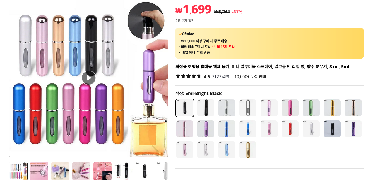 간편하게 쓸 수 있는 향수 스프레이 용기 입니다. 향수를 항상 들고다니기 어려운데, 향수 매니아 분들에게는 정말 좋은 핫 아이템 인 것 같습니다.