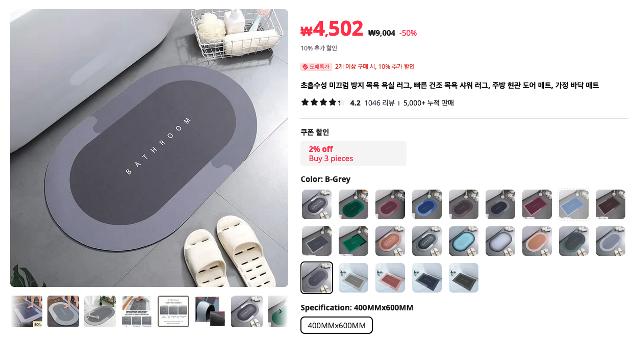 뭔가를 구입할 때 같이 사면 좋은 인테리어 아이템 이네요. 화장실 욕실 앞에 두면 되는 욕실 매트 입니다.