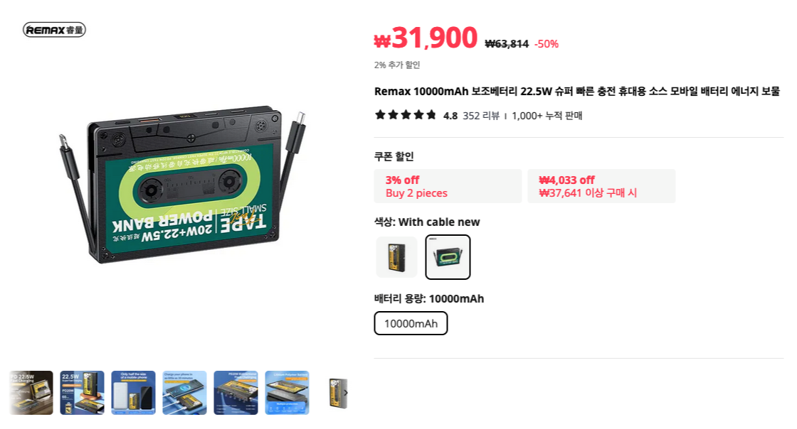 홍콩 영화를 연상시키는 보조배터리 입니다. 녹색 모델을 구입하시면 양 옆으로 아이폰 라이트닝 케이블과, USB Type-C 케이블이 자체 내장되어 있고, 고속 충전이 되어서 추천하는 제품입니다. 디자인이 독특해서 좋고, 휴대하기도 편하고 성능도 좋아요.