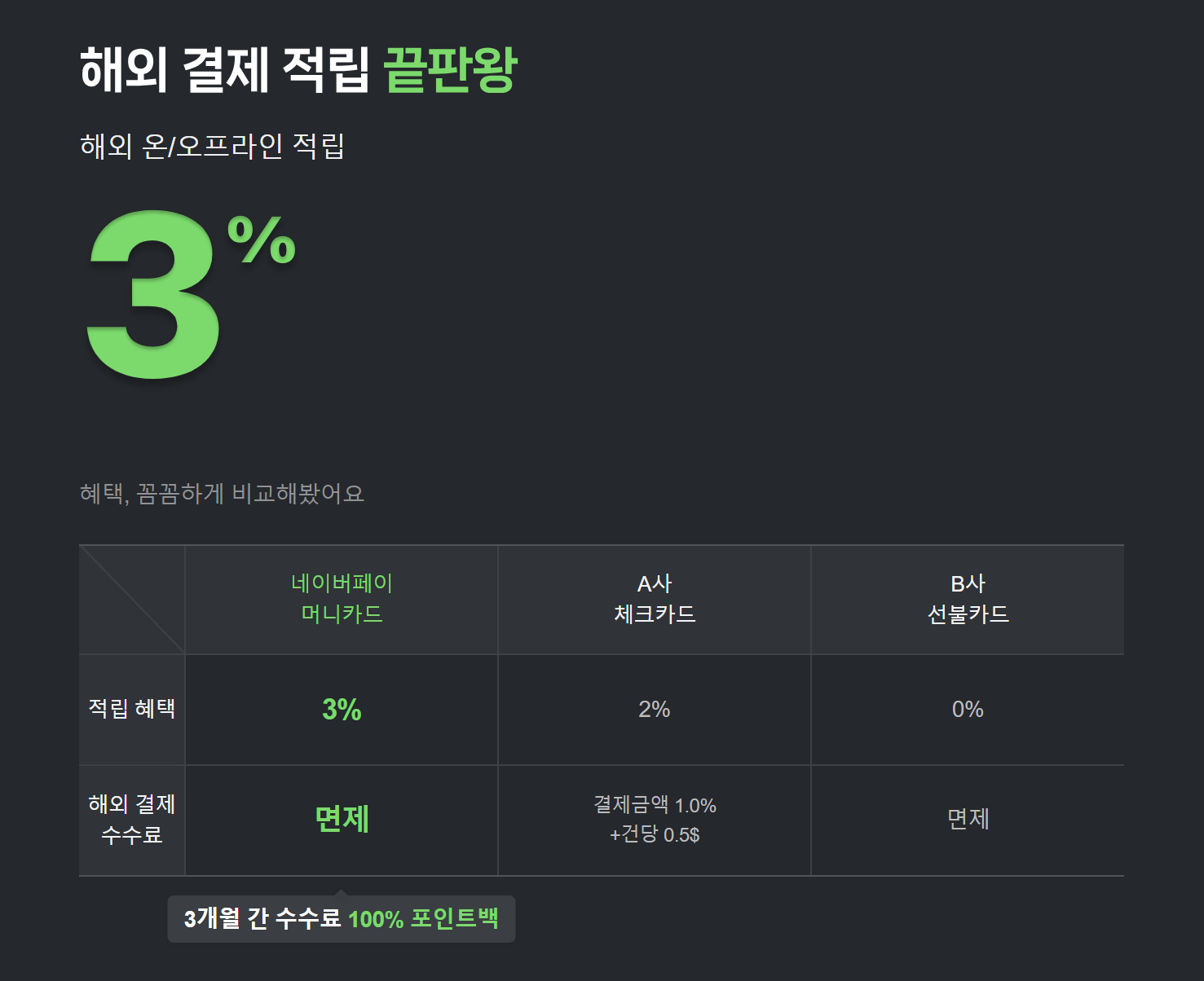일단 네이버페이 머니카드가 다른 체크카드들과는 달리 좋은 적립률을 가지고 있다는 것은 인정해야 겠네요. 해외 결제 수수료도 3개월간은 캐시백을 통해 무료 이벤트를 하는 것 같습니다.