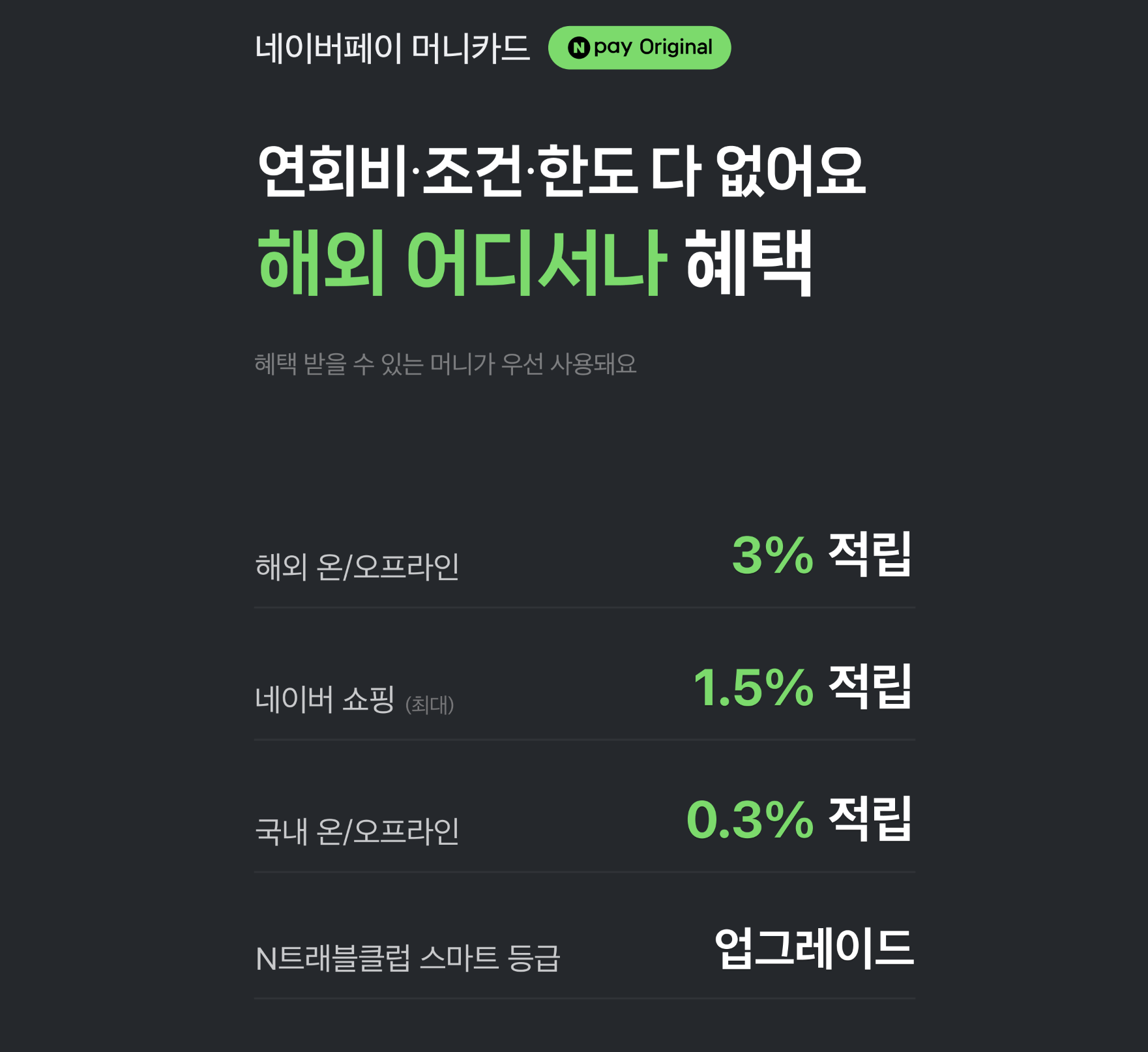 국내 결제도 네이버쇼핑을 많이 사용한다면 1.5% 적립이 되어 쓸만은 합니다. 다만 현대카드 네이버페이 신용카드를 사용하고 있으시다면 그게 낫죠. 그건 한달에 20만원 정도는 5% 적립이 되어 1만 포인트를 챙길 수 있으니까요.