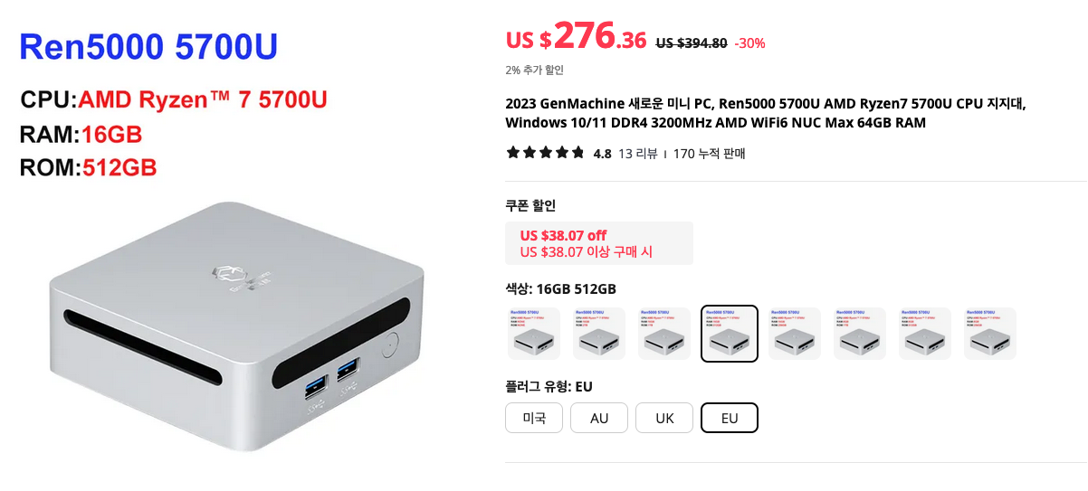비링크 Beelink 미니PC입니다. AMD 라이젠 프로세서로 꽤 고성능 사양인데요. 5560U부터 5800H까지 원하는 사양을 선택할 수 있습니다.