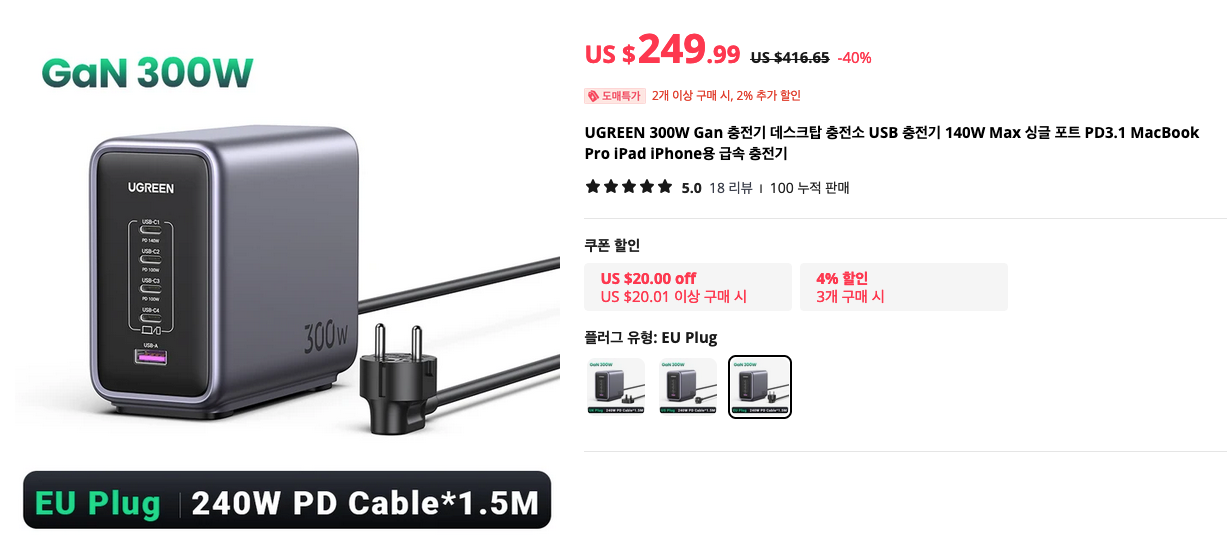 300W라는 무시무시한 출력을 가진 고출력 USB 멀티 충전기 입니다. 맥북프로나 여러대의 USB C to C 충전 디바이스를 가지고 있으시다면 유용하게 사용할 수 있는 최고의 아이템이네요.