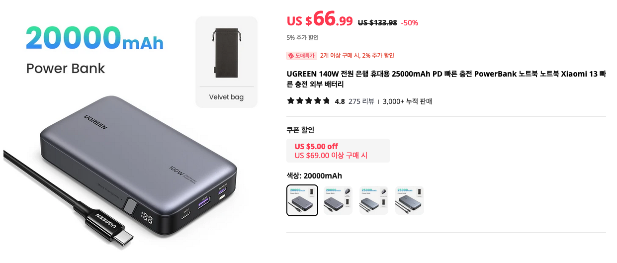 최근에는 은근 대용량 보조배터리들이 인기인듯 합니다. 노트북도 충전할 수 있는 USD PD 고출력 제품들인데요. Ugreen은 꽤 퀄리티가 좋기로 유명하죠. 2만 mAh이상의 보조배터리를 찾으신다면 선택해보시기 바랍니다.