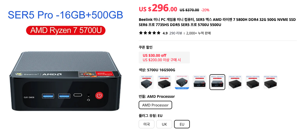비링크 Beelink 미니PC입니다. AMD 라이젠 프로세서로 꽤 고성능 사양인데요. 5560U부터 5800H까지 원하는 사양을 선택할 수 있습니다.