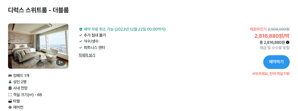 * 참고로 특별한 날이 아닌 평일 기준으로는 약 50~56만원에 디럭스룸을 예약할 수 있고, 프리미어룸은 56~58만원, 그리고 시그니엘 프리미어 룸은 61만원에서 64만원에 예약이 가능하네요.