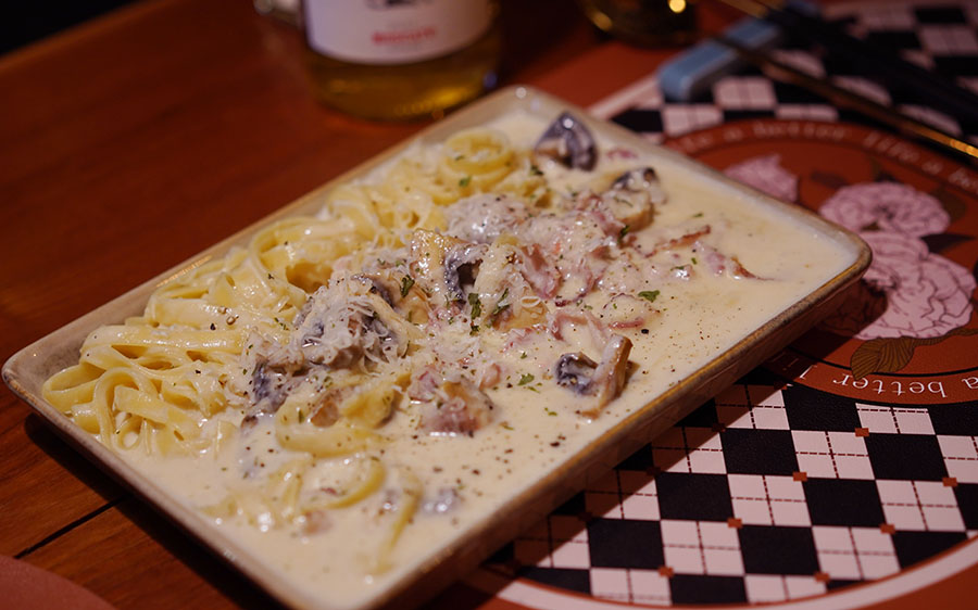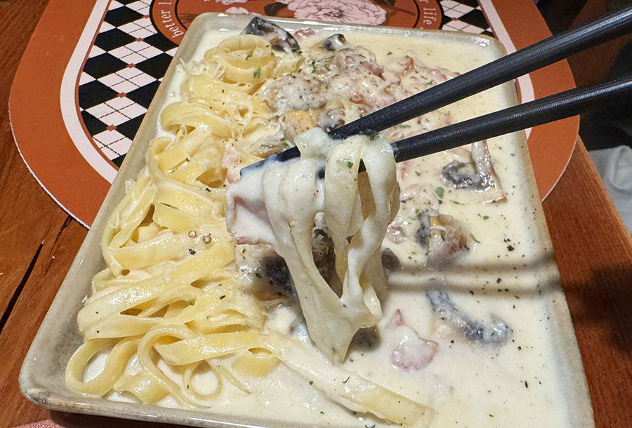 그리고 버섯 크림 파스타 입니다. 메뉴판 설명에는 살짝 매콤하다고 했는데, 저는 매운 맛은 거의 느껴지진 않았고, 매우 고소한 맛이라서 족더군요. 맛을 잘 음미해보니 살짝 뒷맛이 매운 것도 같았는데요. 아마도 청양고추를 조금 가미한 은은한 매운맛인듯 합니다. 덕분에 크리미 하면서도 살짝 매운 맛이 전해져서 굉장히 마음에 들더군요. 크림 파스타를 좋아하는 분들에게 추천해볼만 합니다.