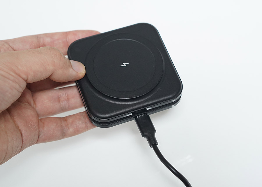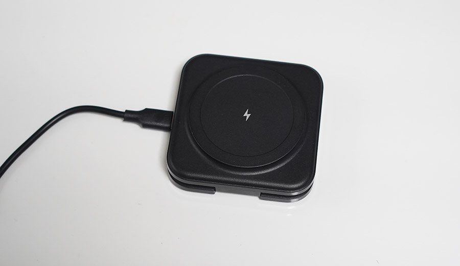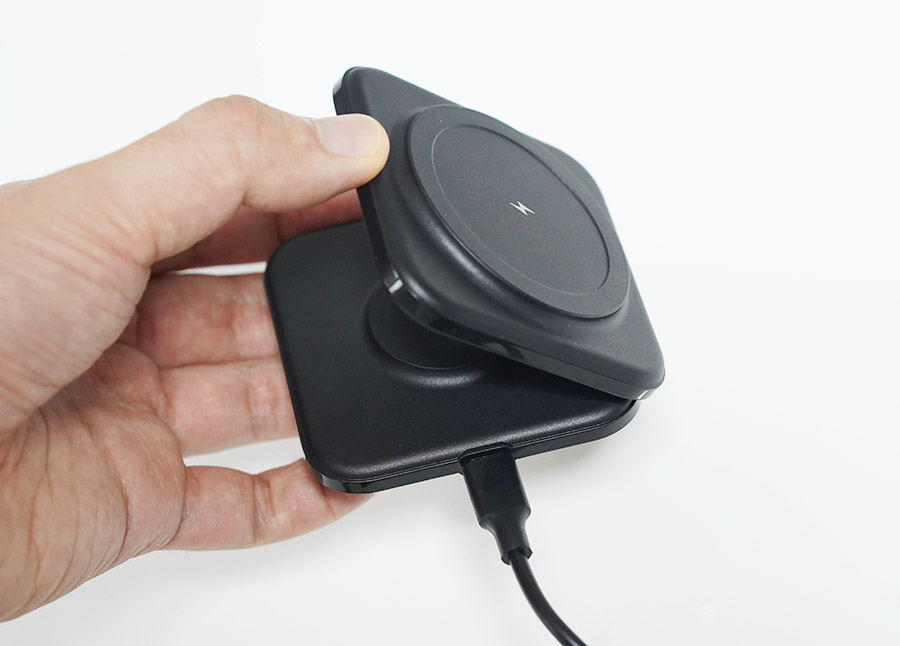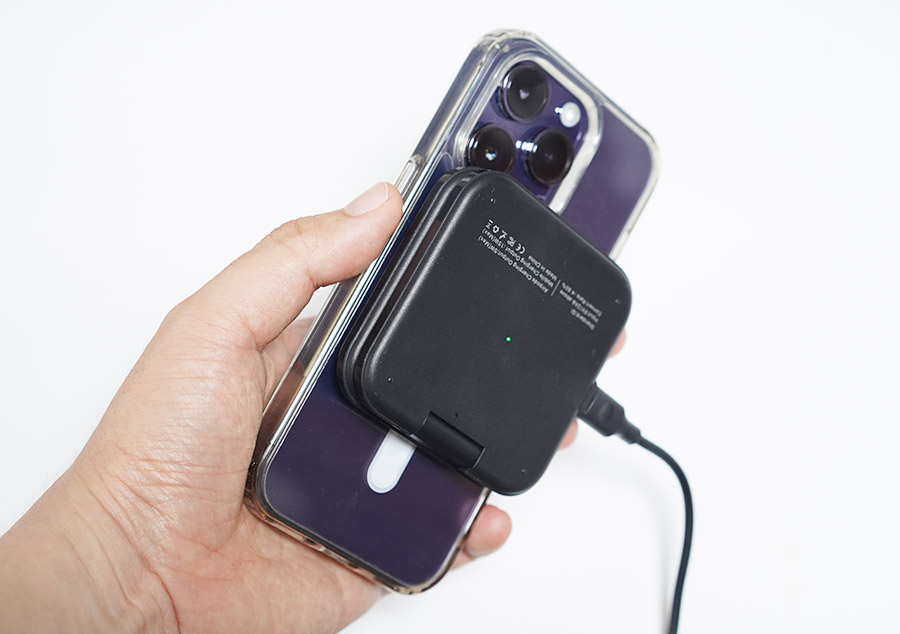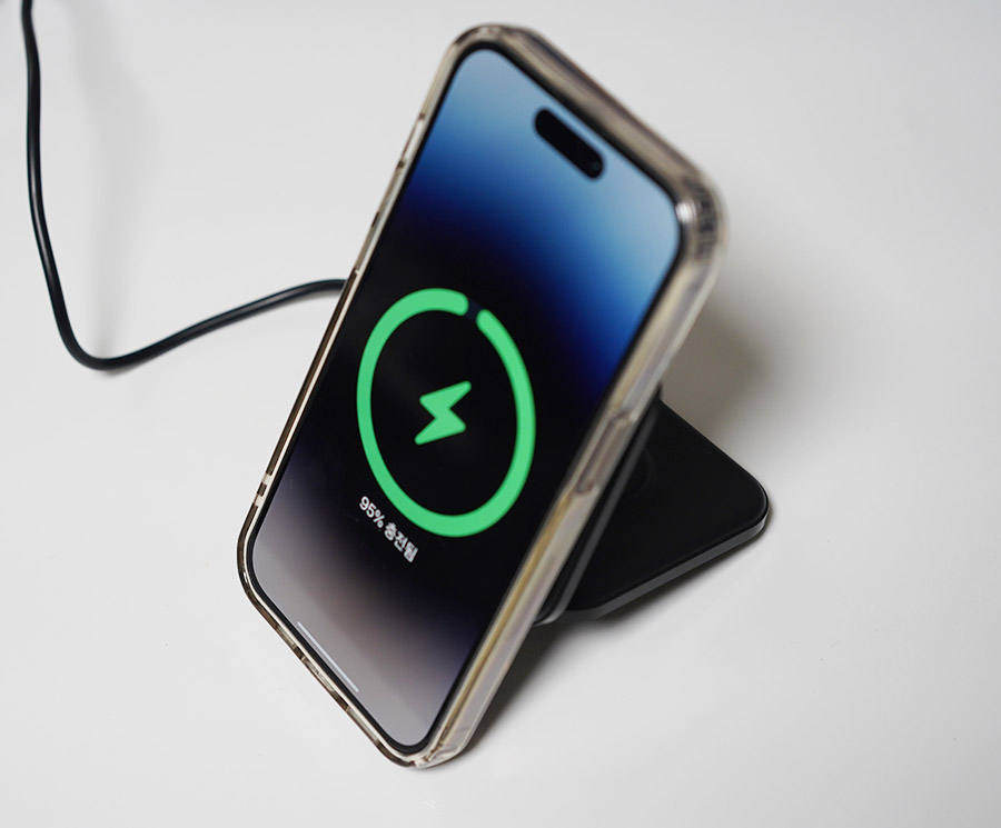 이렇게 맥세이프로 달라붙어 충전이 됩니다. 신기하게도 저속 충전을 해도 맥세이프 링 애니메이션이 뜨는 기분 좋은 제품입니다. (일부 제품은 고속 충전시에마 맥세이프 링 애니메이션이 뜨도록 설계되어 있음)
