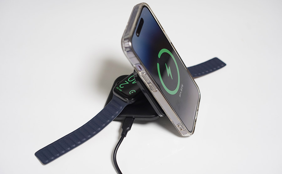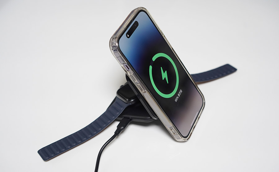 아무튼 이렇게 살짝 펼친 상태에서는 거치대로 쓰면서, 애플워치와 아이폰을 동시에 충전할 수 있고...