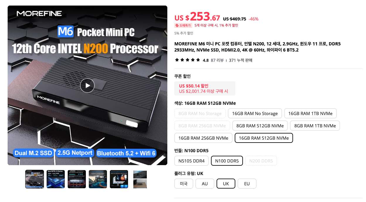 제가 2024년에 구입하려고 하는 사무용 미니PC 입니다. 모파인 (Morefine)의 제품인데, N100 프로세서에 16GB 램을 탑재하면 오피스 작업이랑 웹서핑, 포토샵 작업을 하는데 큰 무리가 없는데요. 가격도 좋고 휴대하기도 편한 디자인이라 마음에 들더군요.