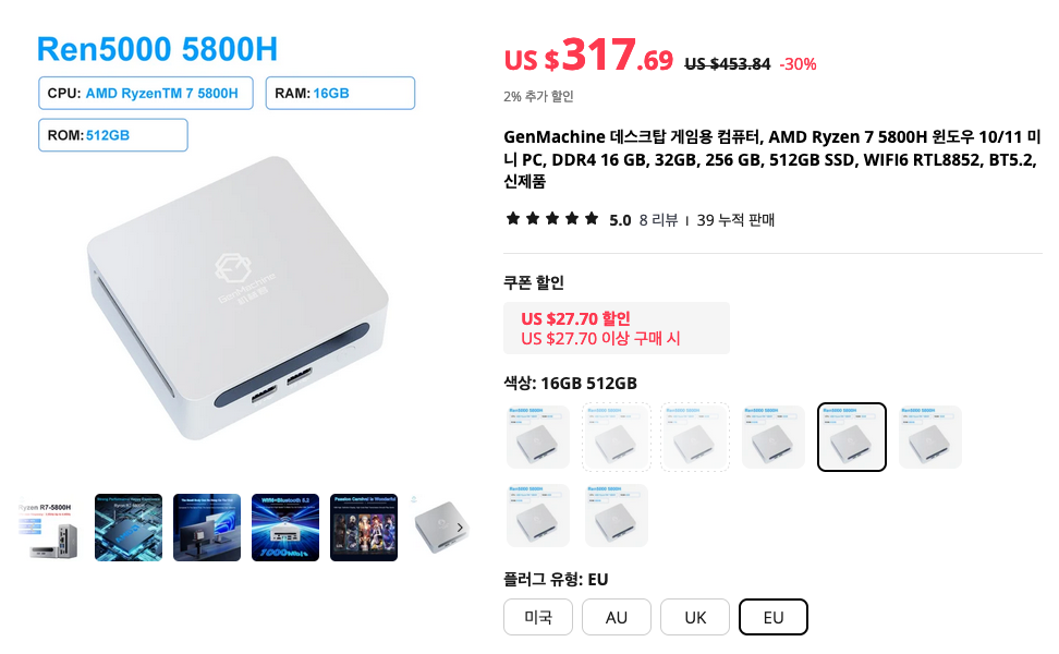 디자인 깔끔하고 약간의 고성능 미니 컴퓨터를 원하시면 추천하는 젠머신의 AMD 5800H 프로세서를 탑재한 모델입니다. 이거 정말 아담한 사이즈에 알루미늄 바디로 되어 있어서 꽤 예쁩니다.